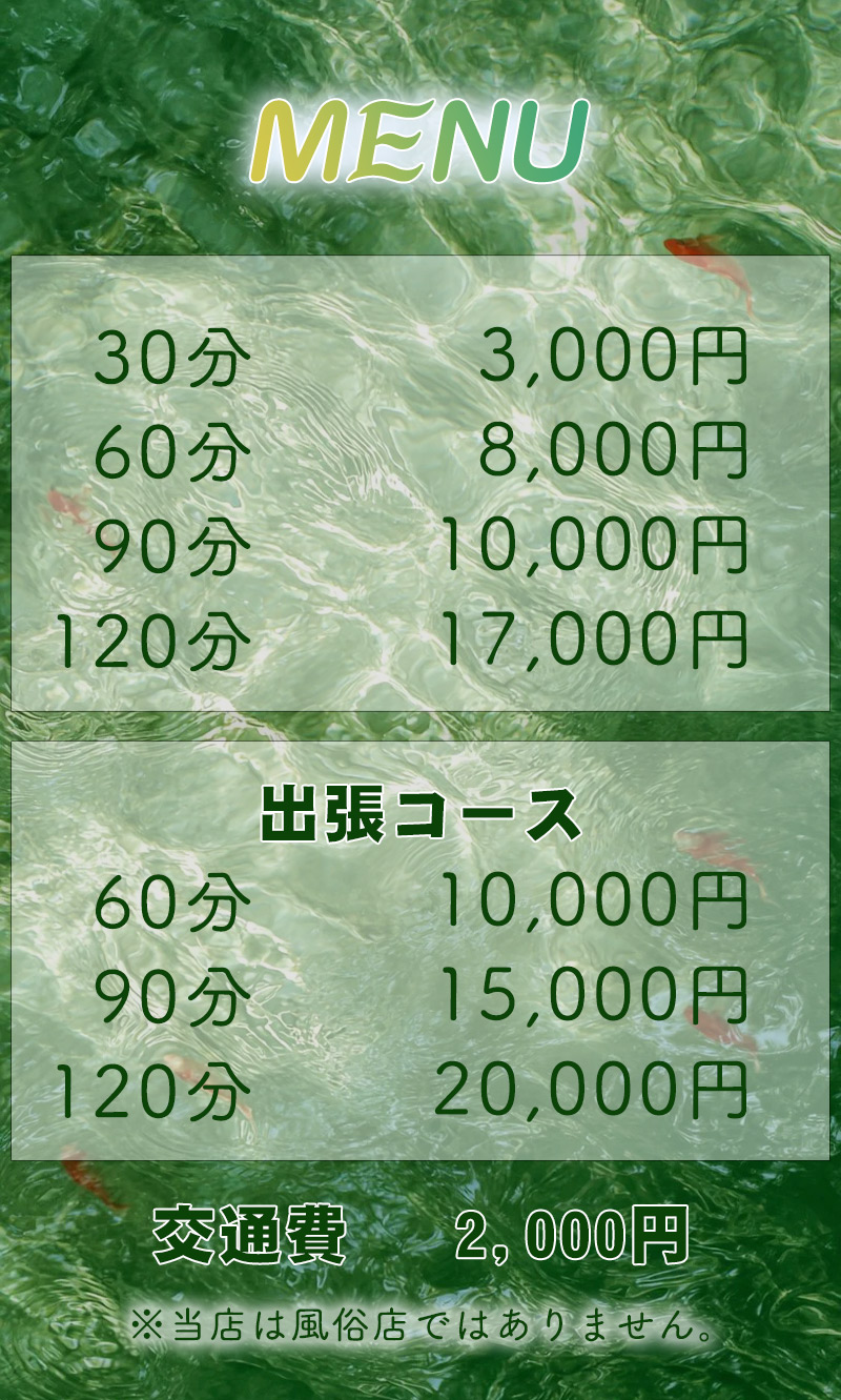 毎日頑張っている紳士の皆様、日頃の疲れになっている身体と心を、幸福なる雰囲気包まれた癒しの場所、落ちついた部屋の個室で可愛いセラピスト達がお待ちしております。当店のセラピストは若く容姿端麗にこだわりました、まるで蜜のように甘く幸せな空間でゆったりとした時間をお過ごし下さい。